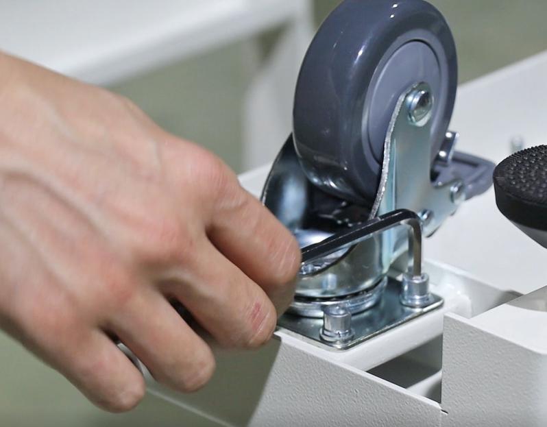 6. Install casters: Our machine can be pushed easily because of the design of casters, which need to be installed after the customer receives it. There are four casters in total, and each caster has four screw holes. Align and tighten carefully.