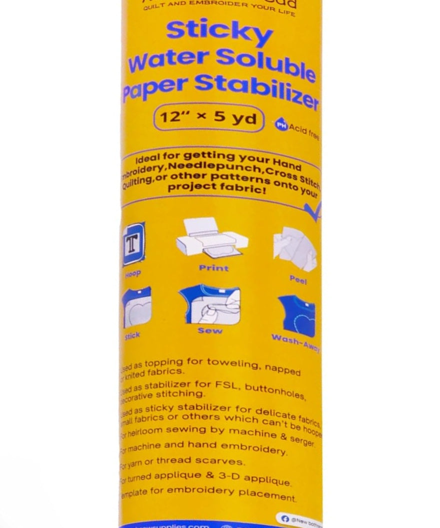 Sticky Water Soluble Paper Stabilizer is a printable temporary self-adhesive, fabric-like stabilizer which features a strong adhesive on one side that easily sticks to the back of the fabric and prevent any shifting or sliding of the fabric during the embroidery process. It dissolves completely when immersed in cold or warm water leaving no backing at all. Sticky Water Soluble Paper Stabilizer is a great choice for both embroidery backing and topping.