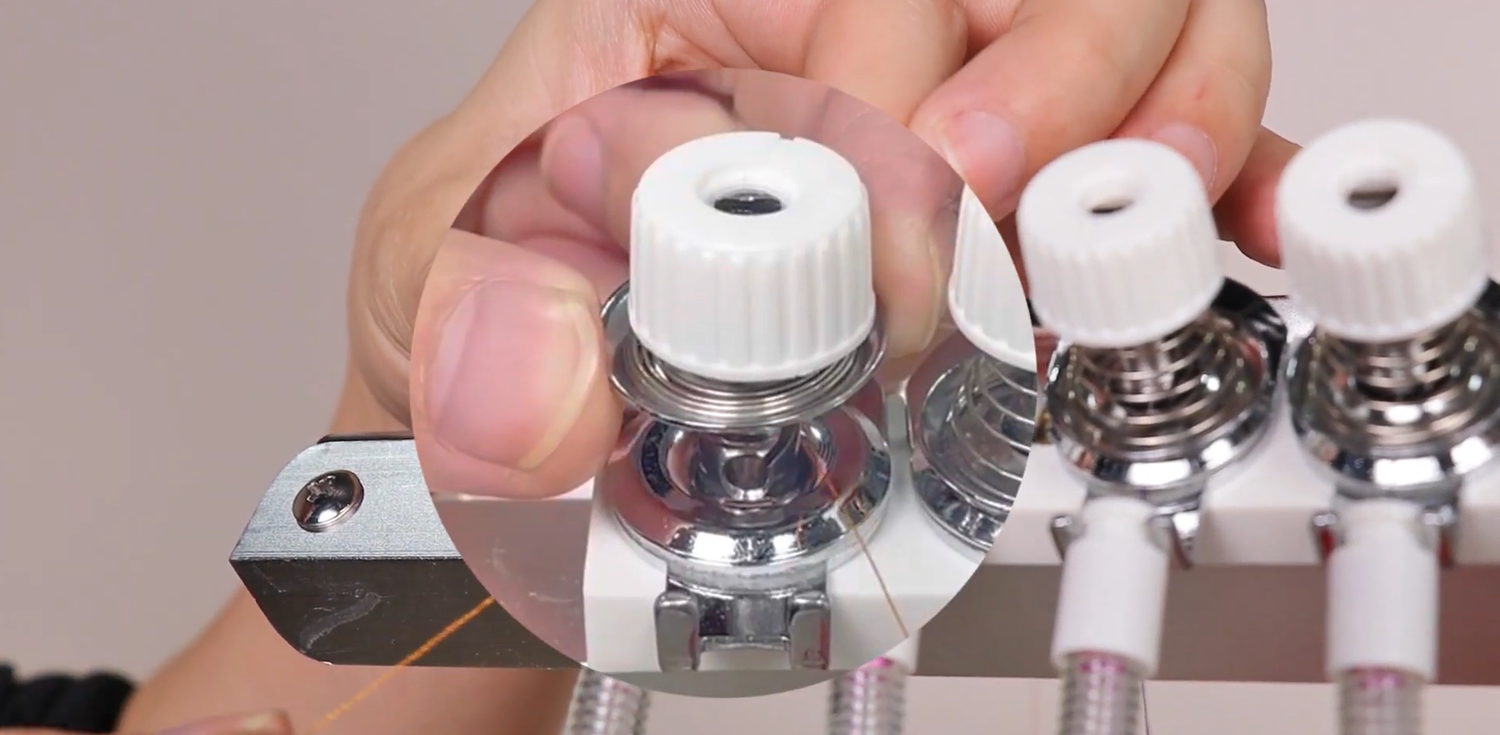 3. Unwind the spool: place the spool of the corresponding color of your embroidery on the vertical spool spool on the top of the machine, and then we can start threading.