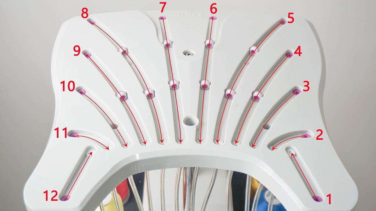 5. Upper thread guide: First thread the thread through the upper thread guide, which is the small metal ring near the spool shaft. S1201 has 12 corresponding wire holes, and S1501 also has 15. Please go through them in order, 1-1, 2-2. If you disturb the order, it will definitely affect the normal use of the sewing machine.
