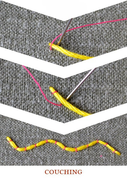 Forcouching, you’ll need two threads. One is the base thread, the second attaches the base to the fabric. Since the base thread lays on top of the fabric all the time, it’s often laid in spirals to cover larger areas.