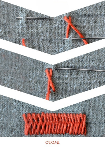 The technique of Otomi embroidery uses a very closely worked closed herringbone stitch. It is traditionally worked over a longer length than the usual herringbone stitch. Because the herringbone stitch crosses over the previous stitches it makes a very stable construction.
