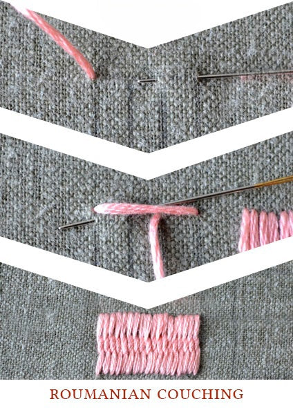 Roumanian Couchingis basically a satin stitch that is tacked down in a certain way. You can cover larger areas than the satin stitch with this embroidery stitch.