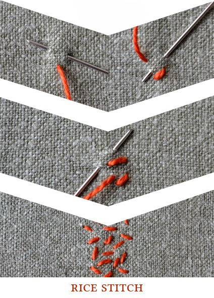 Seed stitch or rice stitch is a set of chaotically stitched embroidery stitches to fill out an area. You can leave them spread out widely to only cover very little of the fabric or set them very close.