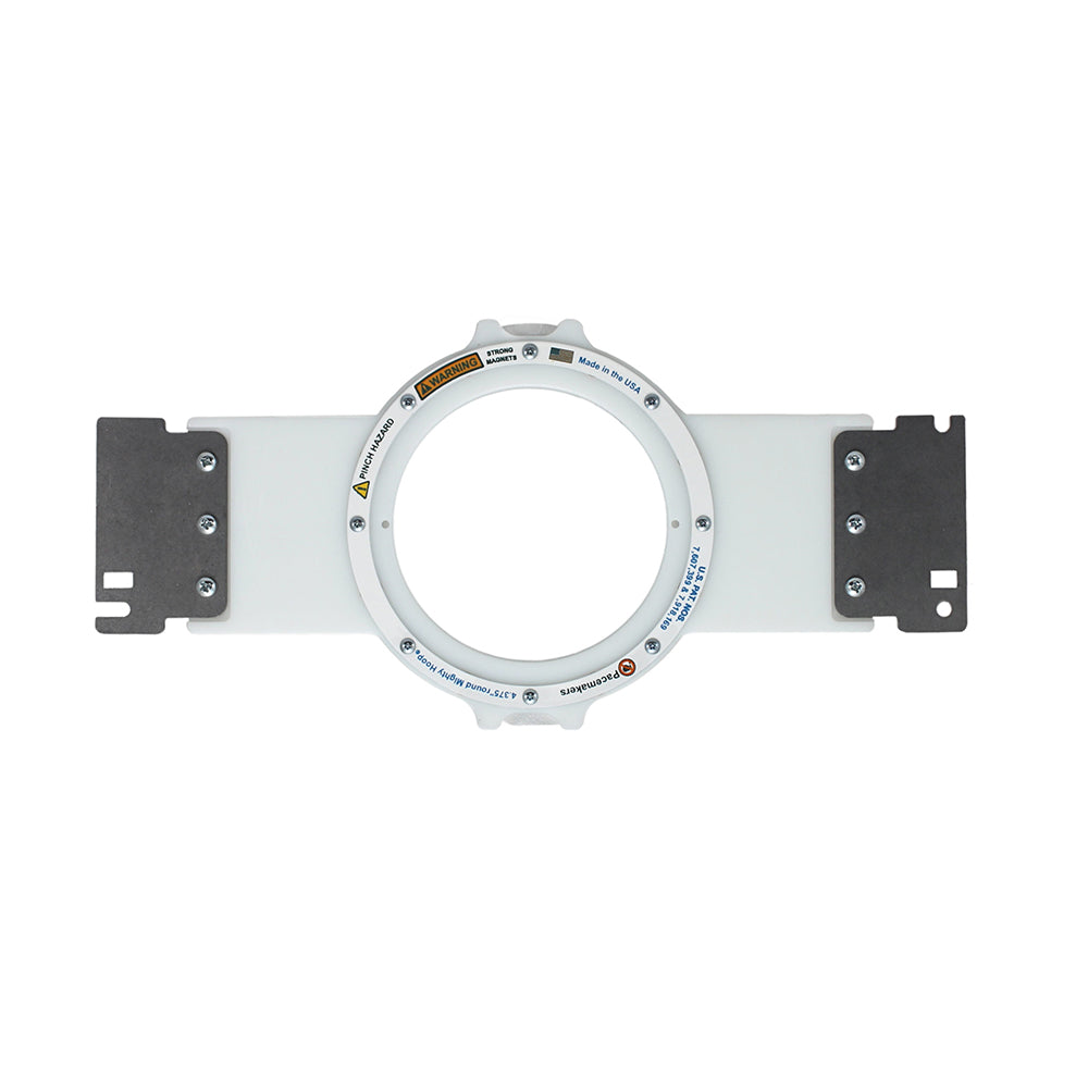 This hoop has an inside dimension that is 4.375″ round. That dimension is the same size as a standard Tajima 12cm hoop, as well as many other hoop brands. Please note that your actual sewing area will be determined by the size of your presser foot. Most machines will be able to sew approximately 3 3/8 to 3 5/8″. This Mighty Hoop was designed for items like sleeves and cap backs. It was not made to hold thick and heavy items, like the original Mighty Hoops. It was designed with smaller magnets allowing it to have a smaller outer ring. This makes it easier to get into tight areas. It will not be able to hoop thick bags, workwear, leather, or other difficult fabric. The 4.25″square Mighty Hoop would be a better option for that type of embroidery. The 4.375″ Mighty Hoop will fit most commercial embroidery machines, including the Brother and Baby Lock 6 and 10 needle machines.